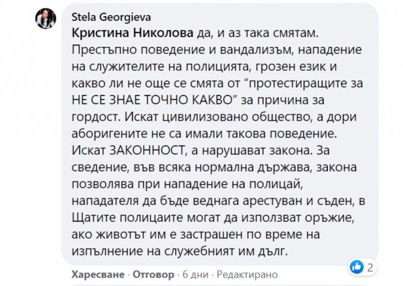 „Престъпно поведение и вандализъм, нападение на служителите на полицията, грозен език и какво ли не още се смята от „протестиращите за НЕ СЕ ЗНАЕ ТОЧНО КАКВО“ за причина за гордост. Искат цивилизовано общество, а дори аборигените не са имали такова поведение.