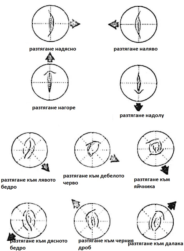 а) Разтягането наляво и надолу може да бъде свързано със стреса в горната дясна част на тялото. Той може да засегне черния дроб, жлъчния мехур, дванадесетопръстника, десния бъбрек и може да причини болка в лумбалния плексус или левия крак.