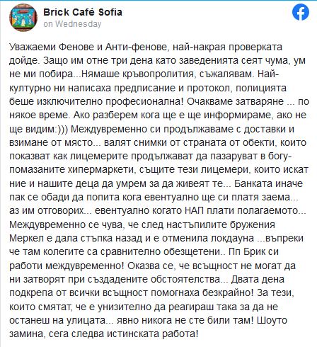 До ситуацията се стигна, след като собственичката на Brick cafe Росица Коцева отказа да се подчини на заповедта на здравния министър за затваряне на заведенията, влязла в сила от 22 март.