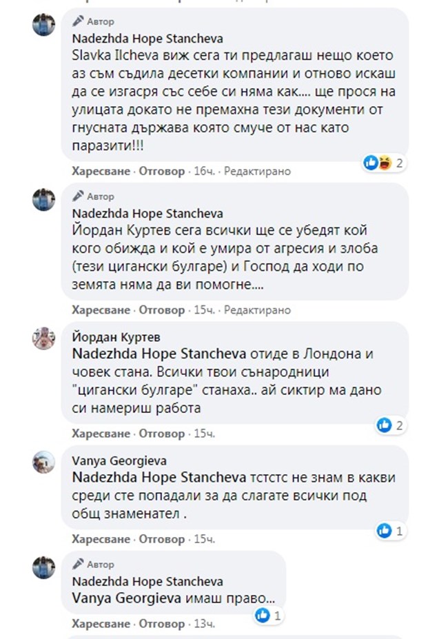 „Аз почистване не търся! Всички чистачки в Англия са професионални свир*аджиийки, да не пропусна и сервитьорките (това е системата на България). Предлагаш нещо, което аз съм съдила десетки компании и отново искаш да се изгавря със себе си, няма как…. ще прося на улицата, докато не премахна тези документи от гнусната държава, която смуче от нас като паразит“, пише Надежда Станчева, като „България Днес“ оставя в почти непроменен стил изказа й.
