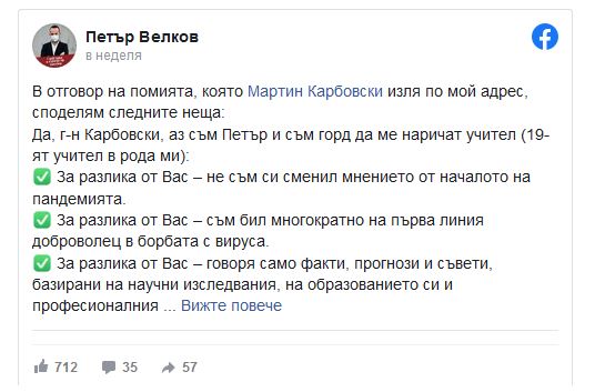 Учителят математик Петър Велков отговори на нападките на журналиста Мартин Карбовски с пост в социалните мрежи: